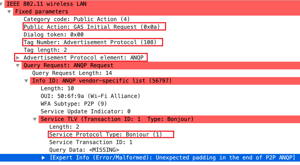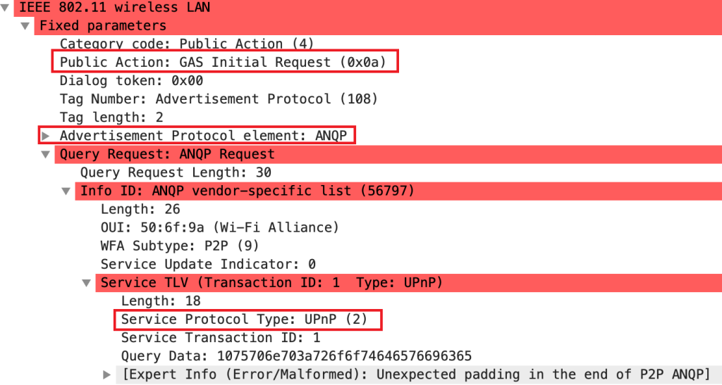 See the below frame capture to check the service discovery request and response frames that are using GAS frame exchange. GAS request frame shows the SD query to check about the UPNP protocol. See the below capture for this