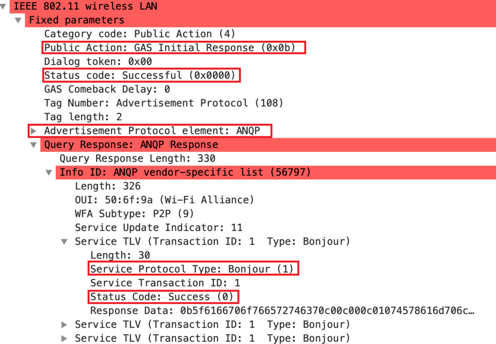 As I told earlier , there are multiple service responses will be sent in a single response , observe the below capture to check the multiple services that are sent in a single response (UPNP and BONJOUR) see the below GAS response frame structure.