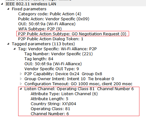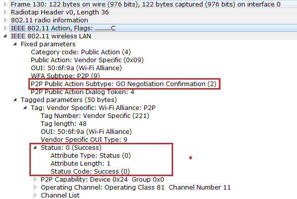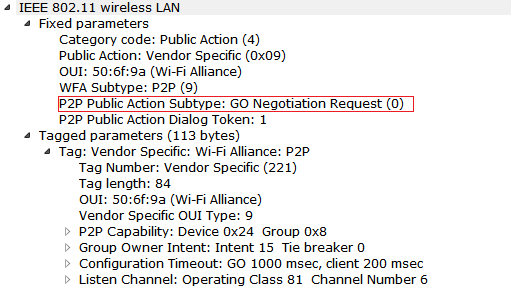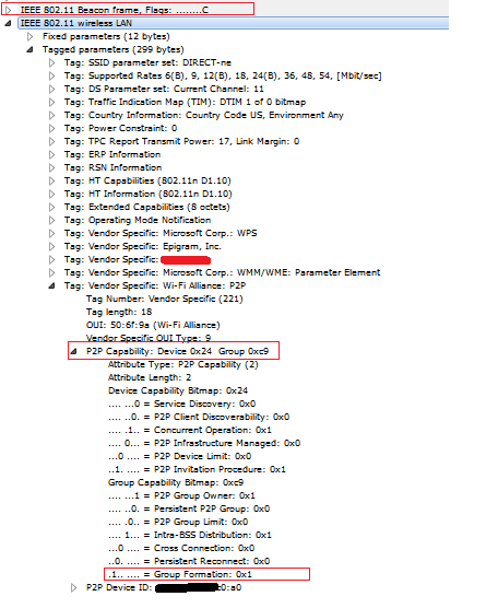 Now open the beacon frame sent by the GO immediately after the Group Owner negotiation and observe the P2P Capability attribute.