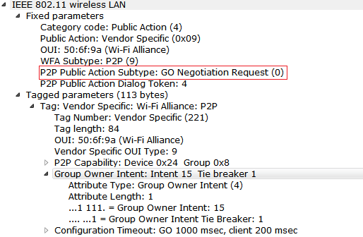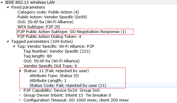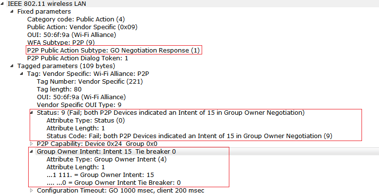 Observe the below capture when the other peer is also sending the intent value as 15, and observe the status code: 9 shown in the capture. P2P group formation fails if both the devices are sending intent values as 15, tie breaker concept does not come in to the picture here as per the Specification.