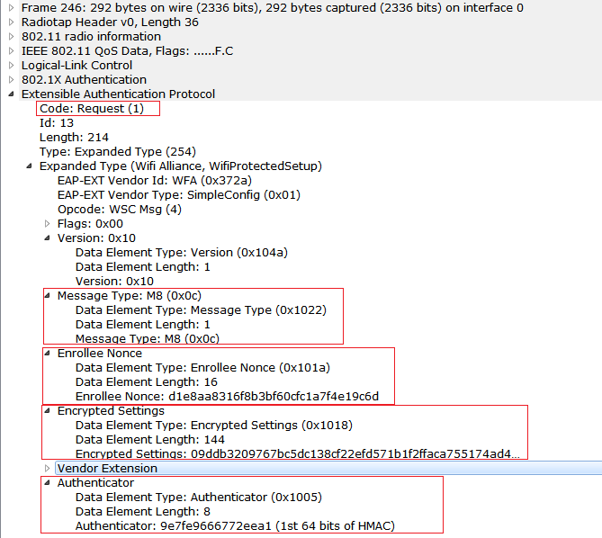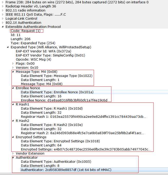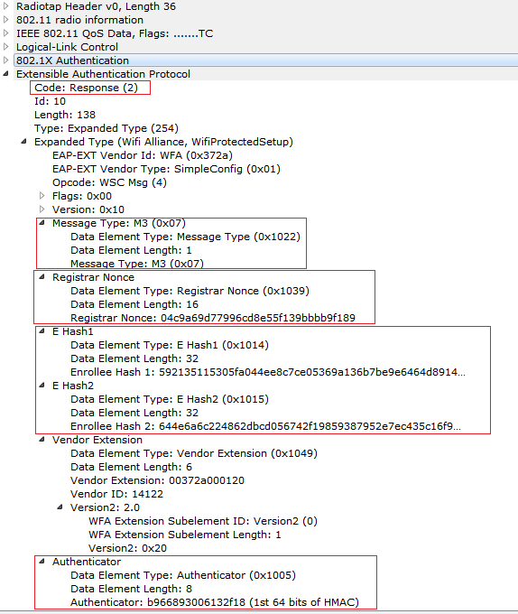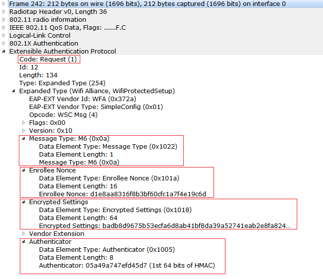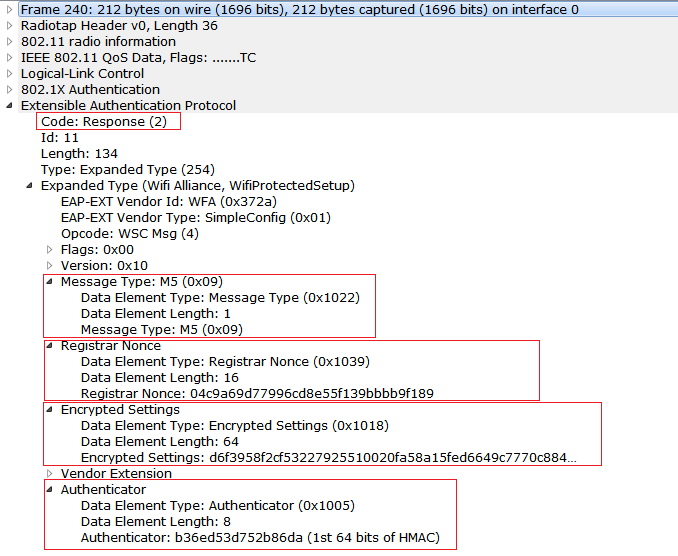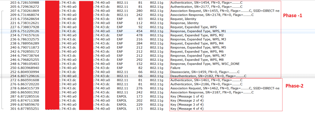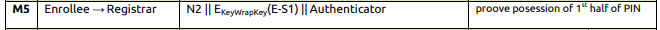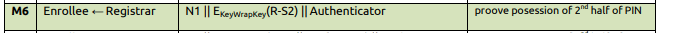 5) Now observe that M4 Message being sent from Registrar to Enrollee. At M4 and M5 Mutual authentication will happen, Registrar has to prove that 1st half of PIN in M4 and Enrollee has to prove the first half of the PIN in the M5. Usually the PIN will be 8 digit number, And if the wrong 1st half PIN is entered then there will not be any messages going after M4 Message. So that we can know that the 1st half of the PIN is incorrect. If the second half of the PIN is wrong then we don’t see any messages going after M6.
