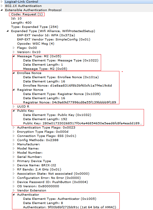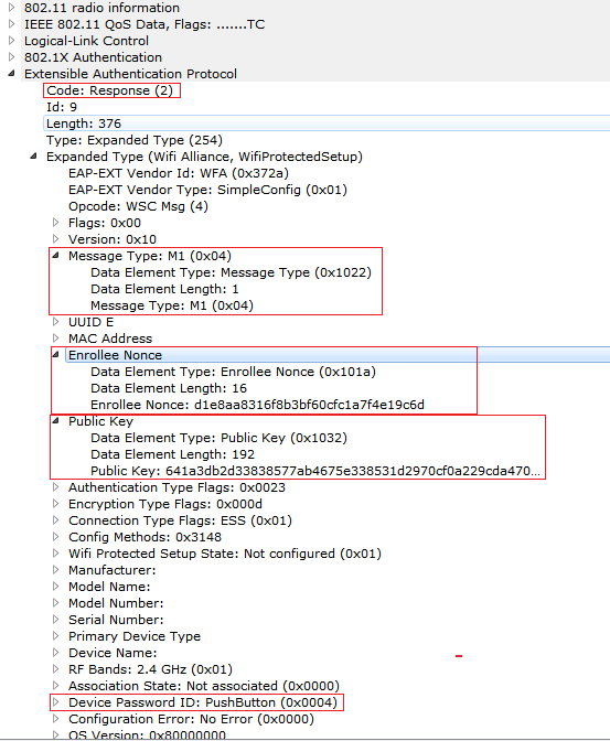Observe the below sniffer capture to check the M2 Message. Here Public key of the Registrar is sent to the Enrollee as a part of Diffie-Helmen Key exchange.