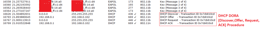 Observe the below image to see DHCP procedure that has started after the phase-2, now we don’t see the DHCP handshake in the sniffer , as these messages are encrypted after the 4-way hand shake, we see the encrypted DHCP frames in the sniffer. We need a private key to see the DHCP hand shake.